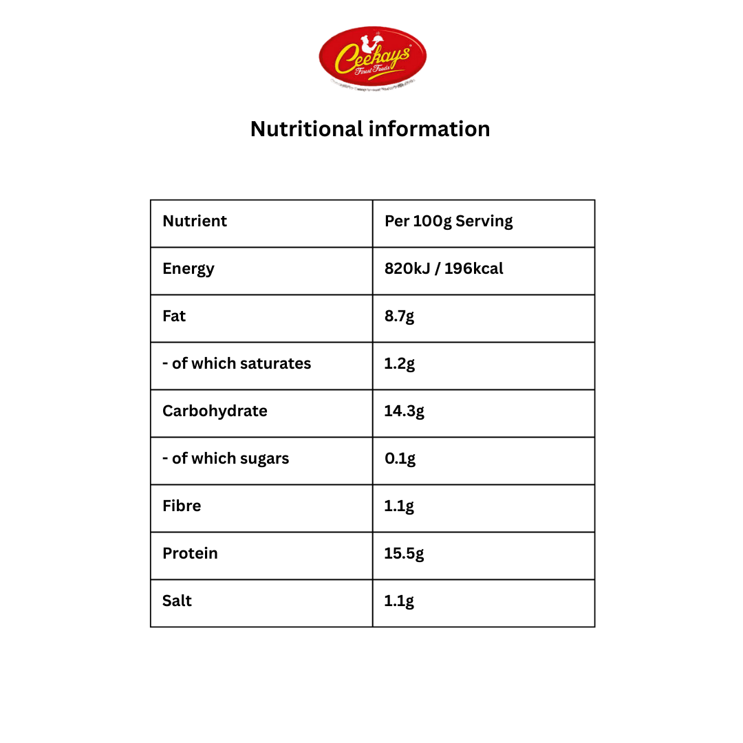 Chicken breast (about 54.5%), water, wheat flour, maize flour, wheat semolina, rapeseed oil, wheat gluten, starch, salt, rice flour, modified starch, raising agents (E450, E500), pepper, dried onion, yeast extract (contains sulphites), egg albumen, dextrose, monosodium glutamate, stabilisers (E451, E450), acidity regulator (E500), natural flavouring, sugar, celery, and anti-caking agent (E551). May contain traces of milk.