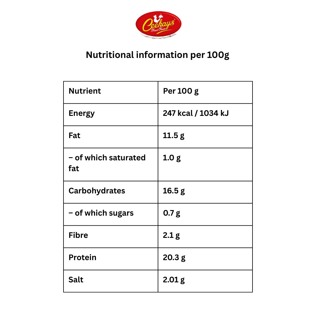 Chicken Breast Fillets (58%), wheat flour, water, rapeseed oil, wheat semolina, salt, maize starch, wheat gluten, breadcrumbs (wheat flour, salt, yeast), monosodium glutamate (E621), sunflower oil, potato starch, garlic powder, stabilisers (E451), raising agents (E450i, E500ii), anticaking agents, black pepper, turmeric extract, paprika extract & flavouring, spices (chilli powder, cayenne, white pepper, black pepper), onion powder, cayenne chilli, white pepper, capsicum extract, black pepper extract, thickener (E415), garlic extract, egg albumen, skimmed milk powder. May contain traces of celery, sulphur dioxide, and sulphites.