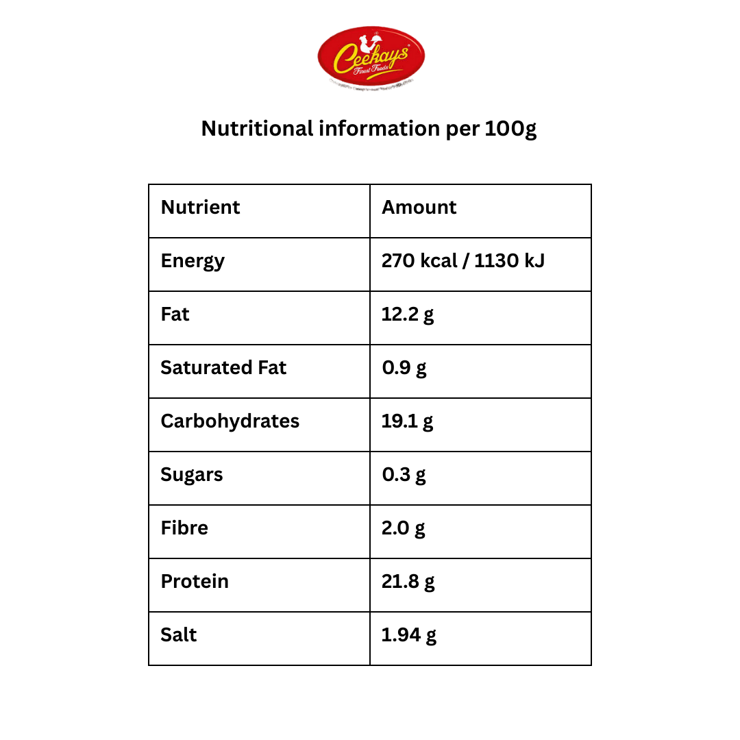 Chicken Breast Fillets (55.3%), Water, WHEAT Flour, WHEAT Semolina, Rapeseed Oil, Salt, Gram Flour, WHEAT Gluten, Breadcrumb [WHEAT Flour, Salt, Yeast Raising Agents: E450, E500(ii)], Maize Flour, Modified Waxy Maize Starch, Maize Starch, Pepper, Sunflower Oil, Monosodium Glutamate, Raising Agents: E450(i) E500(ii), Anti-caking Agent (E551), Dried Yeast, Dextrose, Turmeric Extract, EGG Albumen, Yeast Extract, Colour: Paprika Extract and Flavouring, Starch, Acidity Regulator (E500), Natural Flavouring, Dried Glucose Syrup, Onion Powder, Garlic Powder, Herb, Vegetable Fat (Palm), Herb Extract, Spice Extracts, Skimmed MILK Powder.