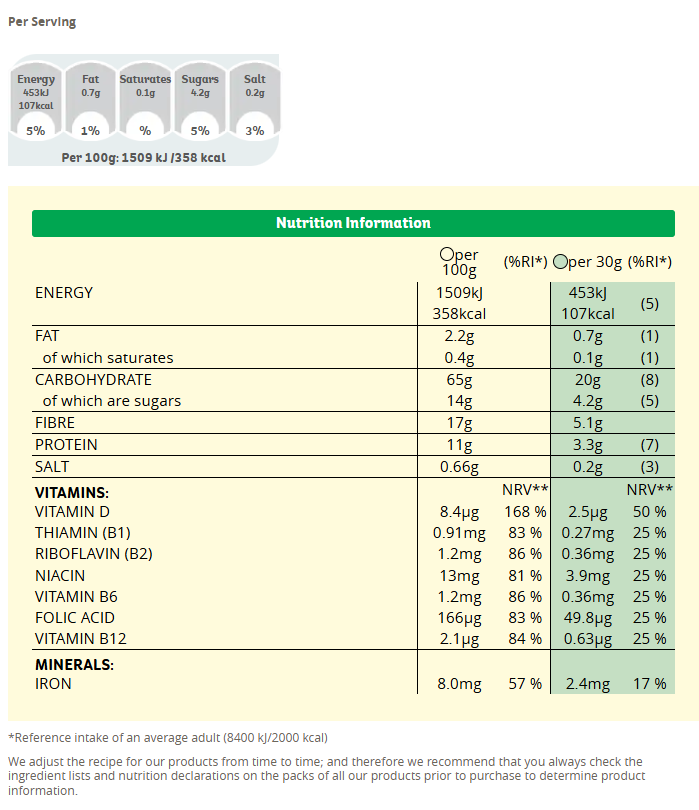 Crunchy wholewheat bran flakes, high in fibre to support healthy digestion. Fortified with vitamins and iron, with no artificial colours or flavours.
