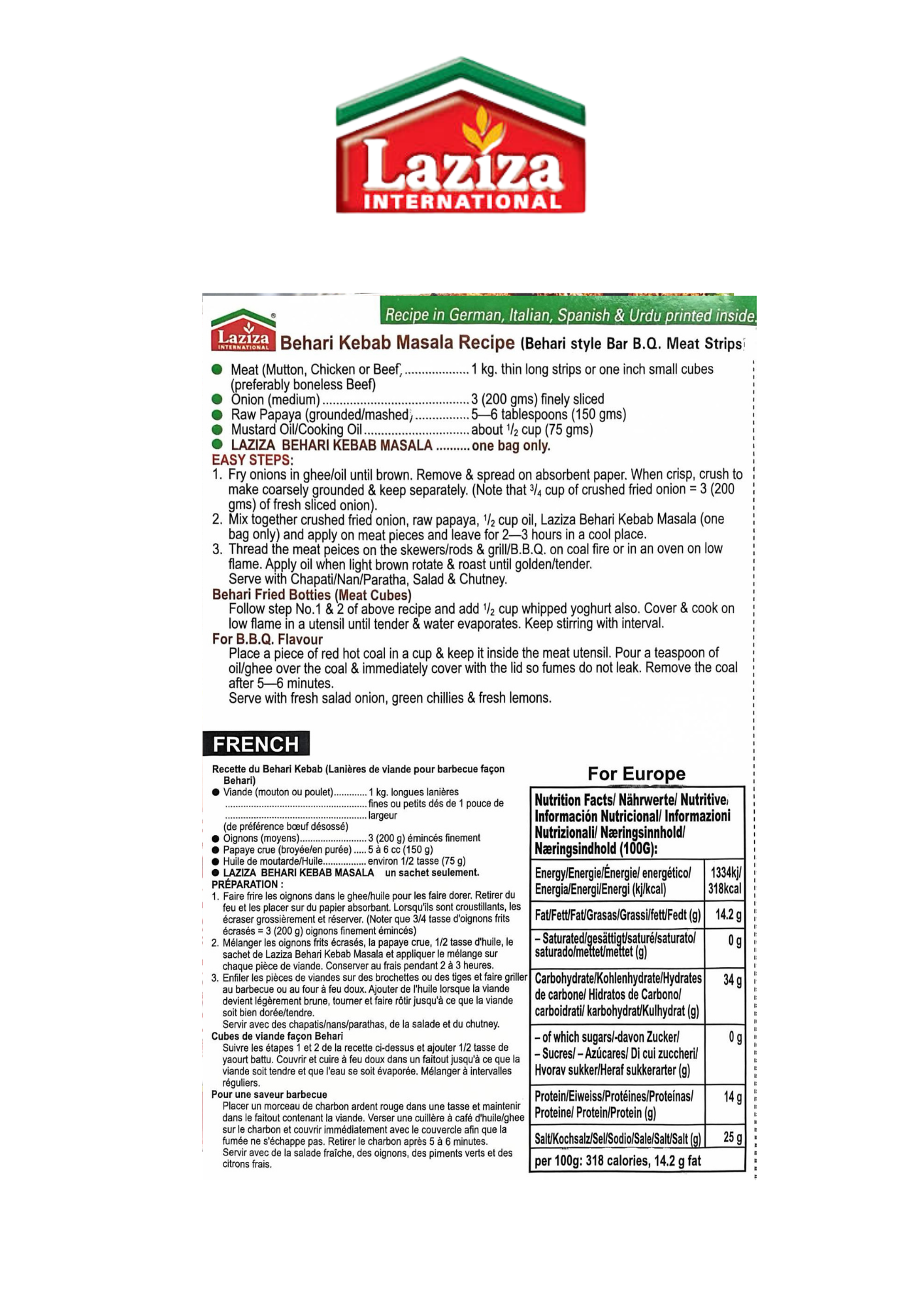 Laziza Behari Kebab Masala is a premium spice blend designed to bring the authentic flavors of traditional Behari kebabs to your kitchen. Infused with a rich mix of spices, this masala ensures a fragrant, flavorful, and aromatic kebab every time.